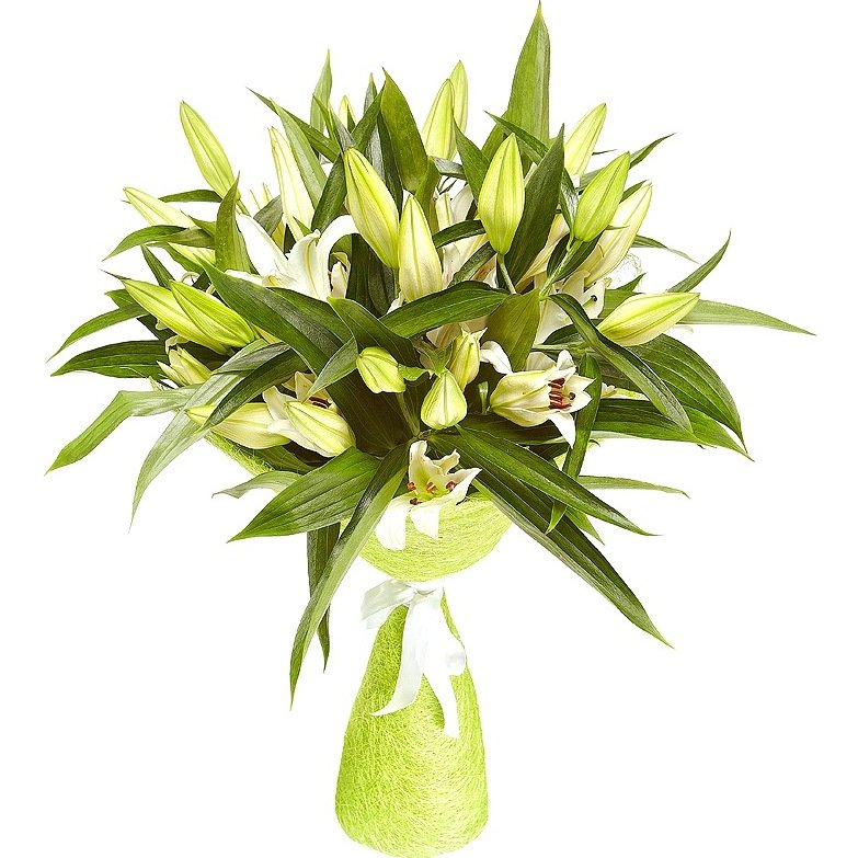 Состав: лилия белая, лента, упаковочная бумага. Малый букет: 3 лилии, средний букет - 5 лилий, большой букет - 9 лилий,