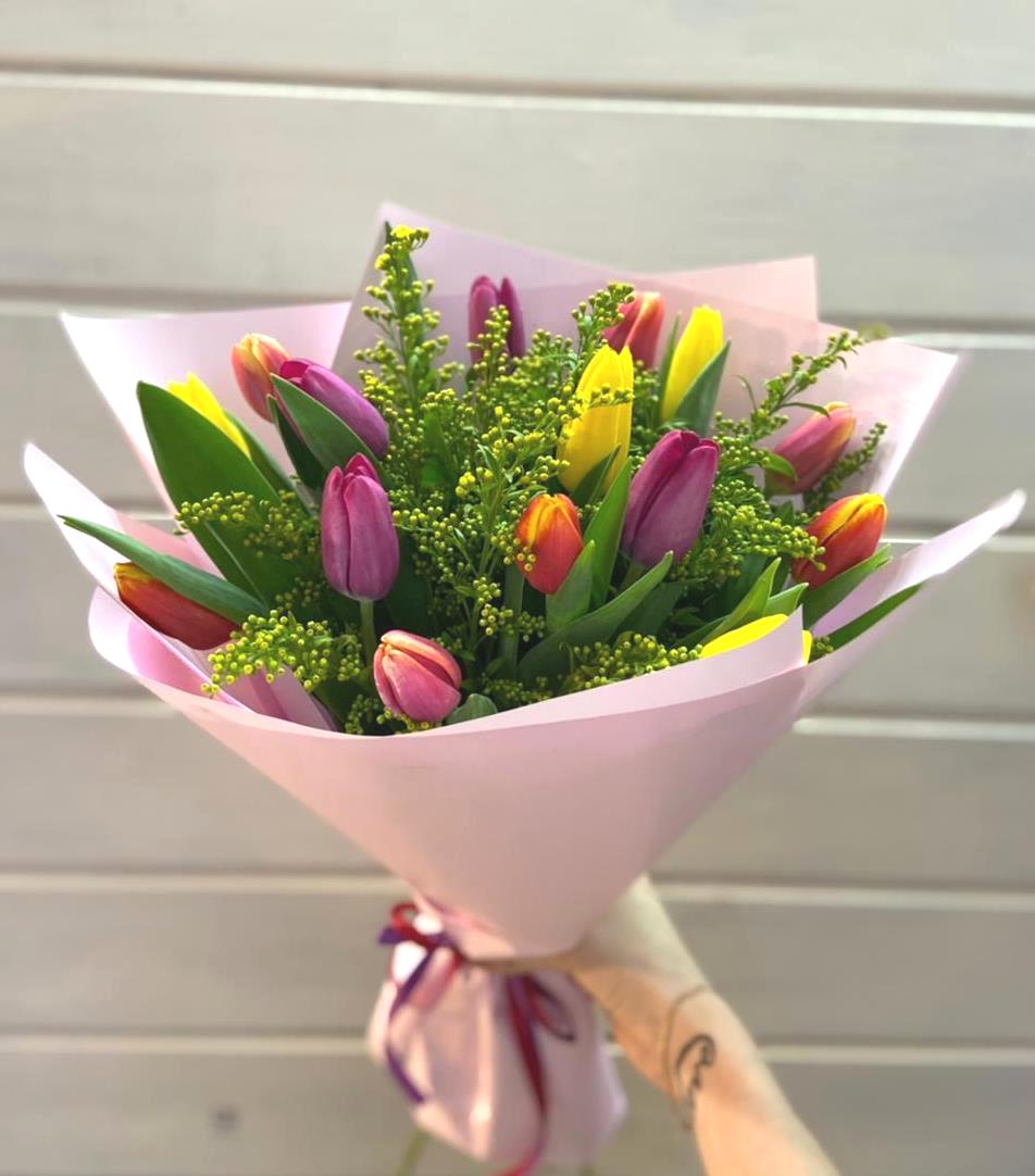 Букет из 15 тюльпанов и солидаго.