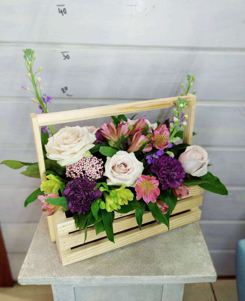 Композиция из цветов в деревянном ящике. L-30 см, H-25см