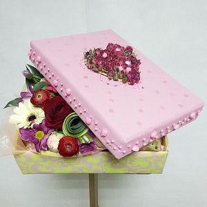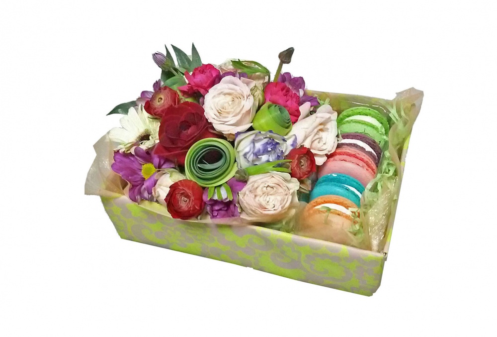 Состав: цветочная композиция, печенье Макарон (или замена на конфеты Рафаэлло) 6 шт. Размер 25х15 см.